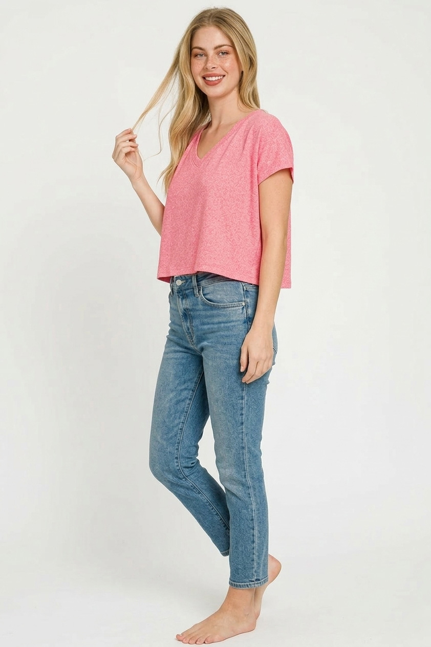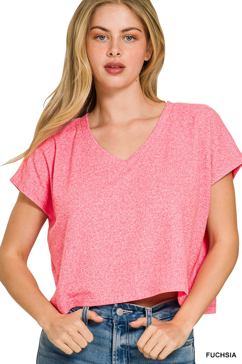 Zenana Soft Melange V-Neck Drop Shoulder Cropped Top