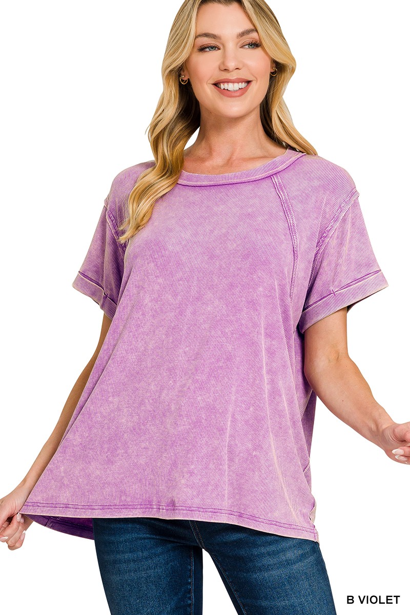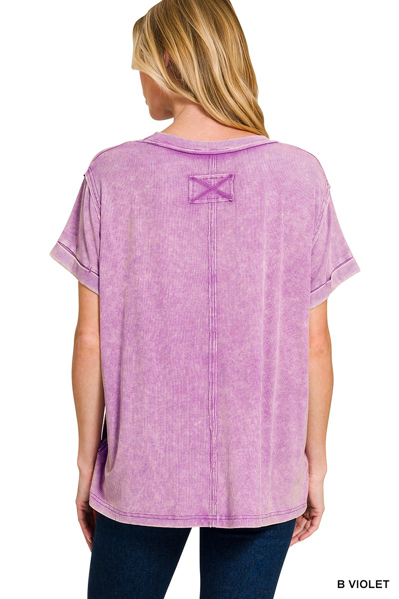 Zenana Washed Ribbed Cuffed Short Sleeve Round Neck Top