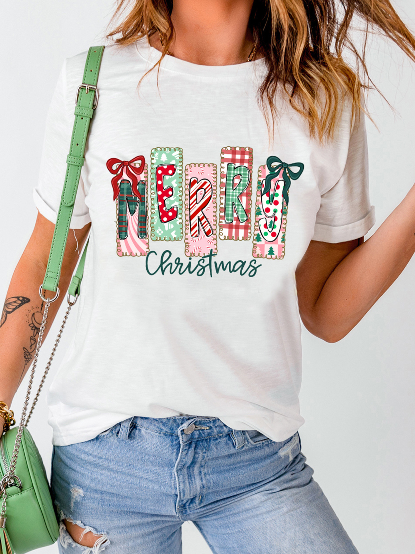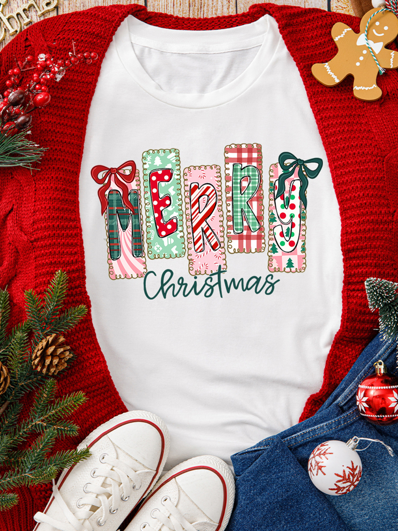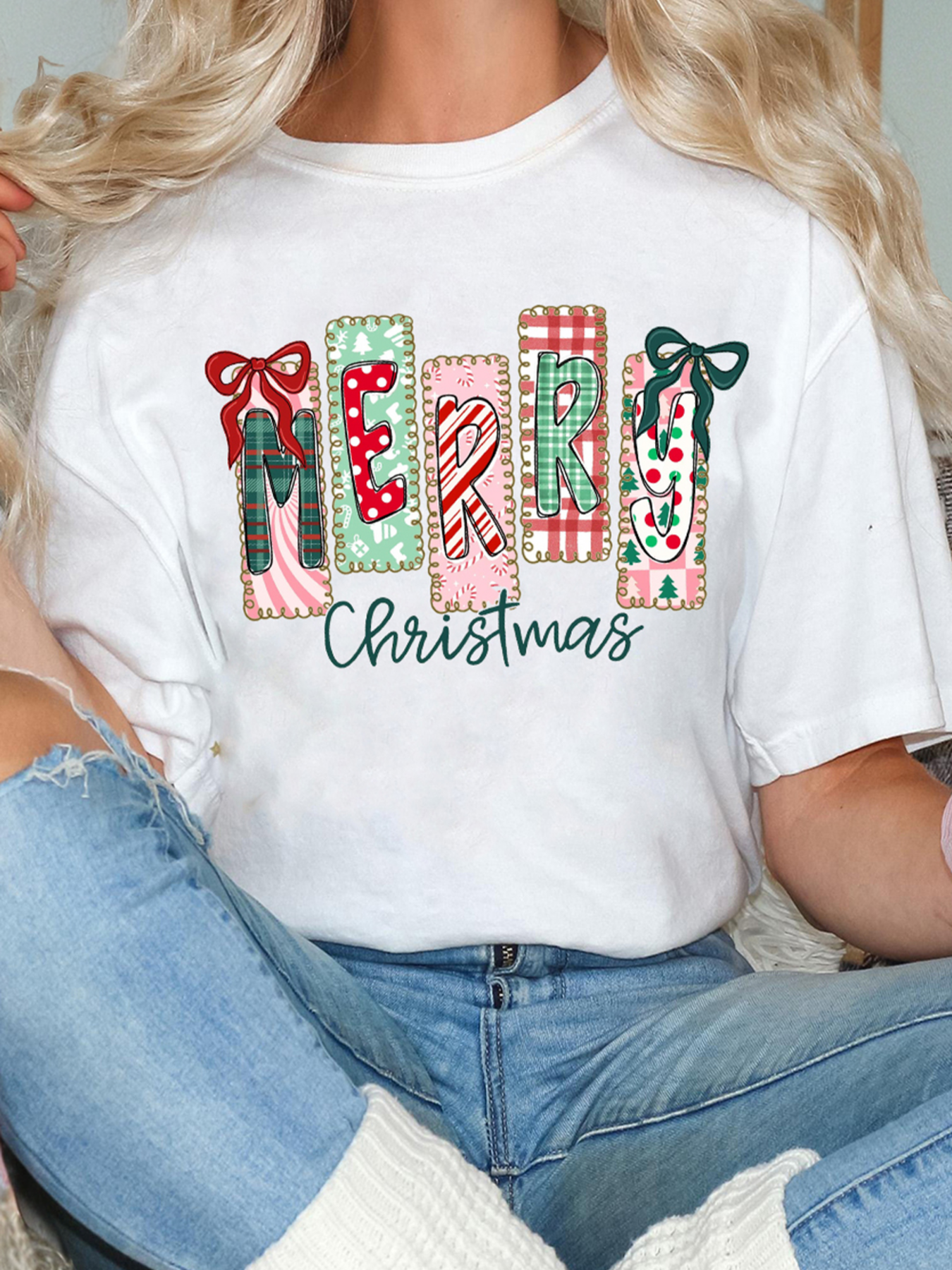 Merry Christmas Ribbon Bow Detail Holiday Graphic Tee