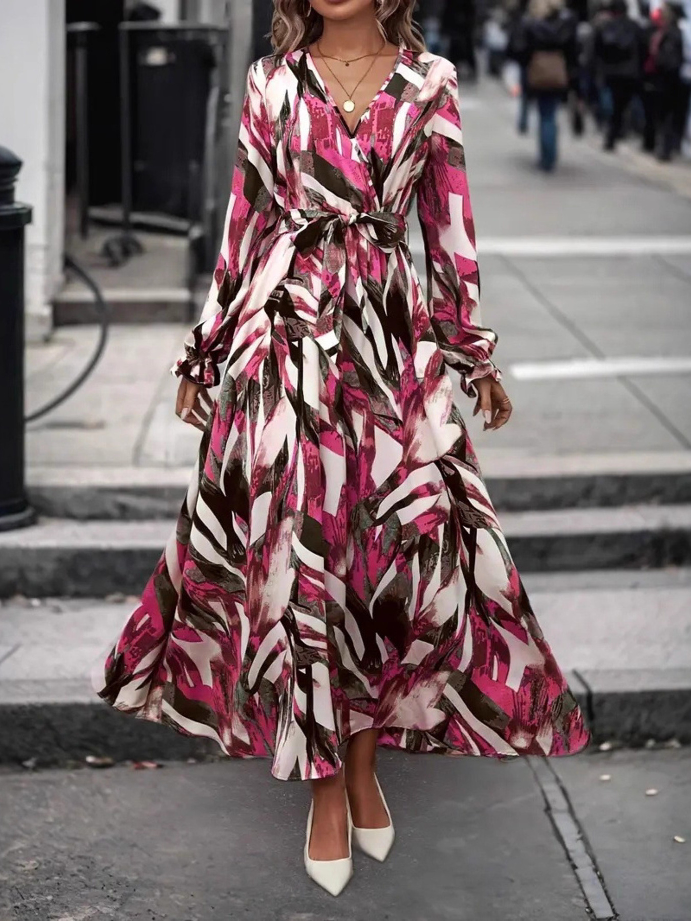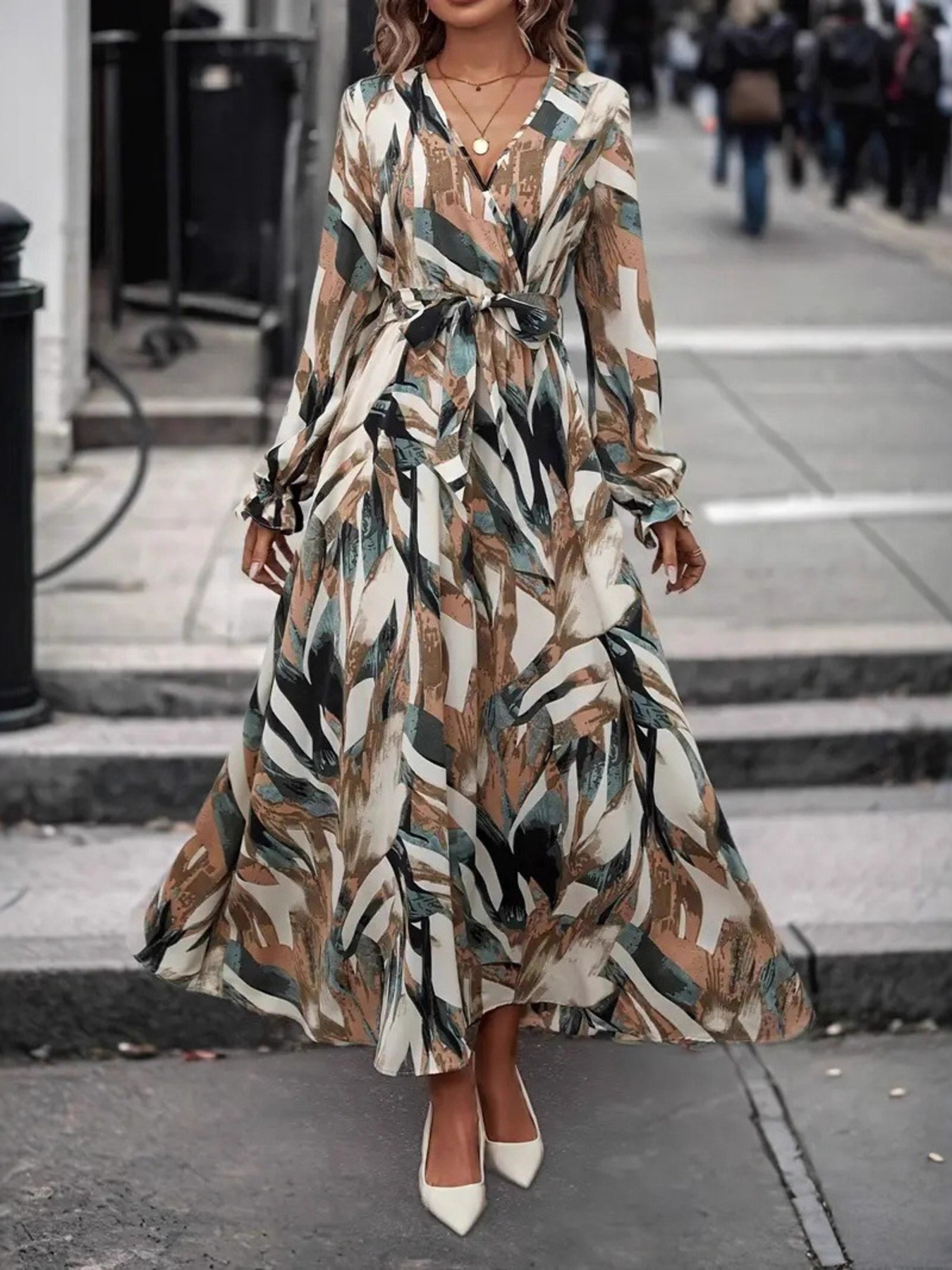 Printed Surplice Flounce Sleeve Maxi Dress