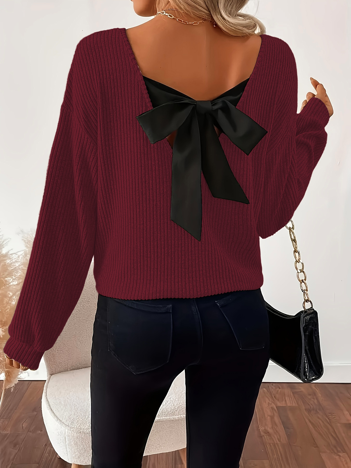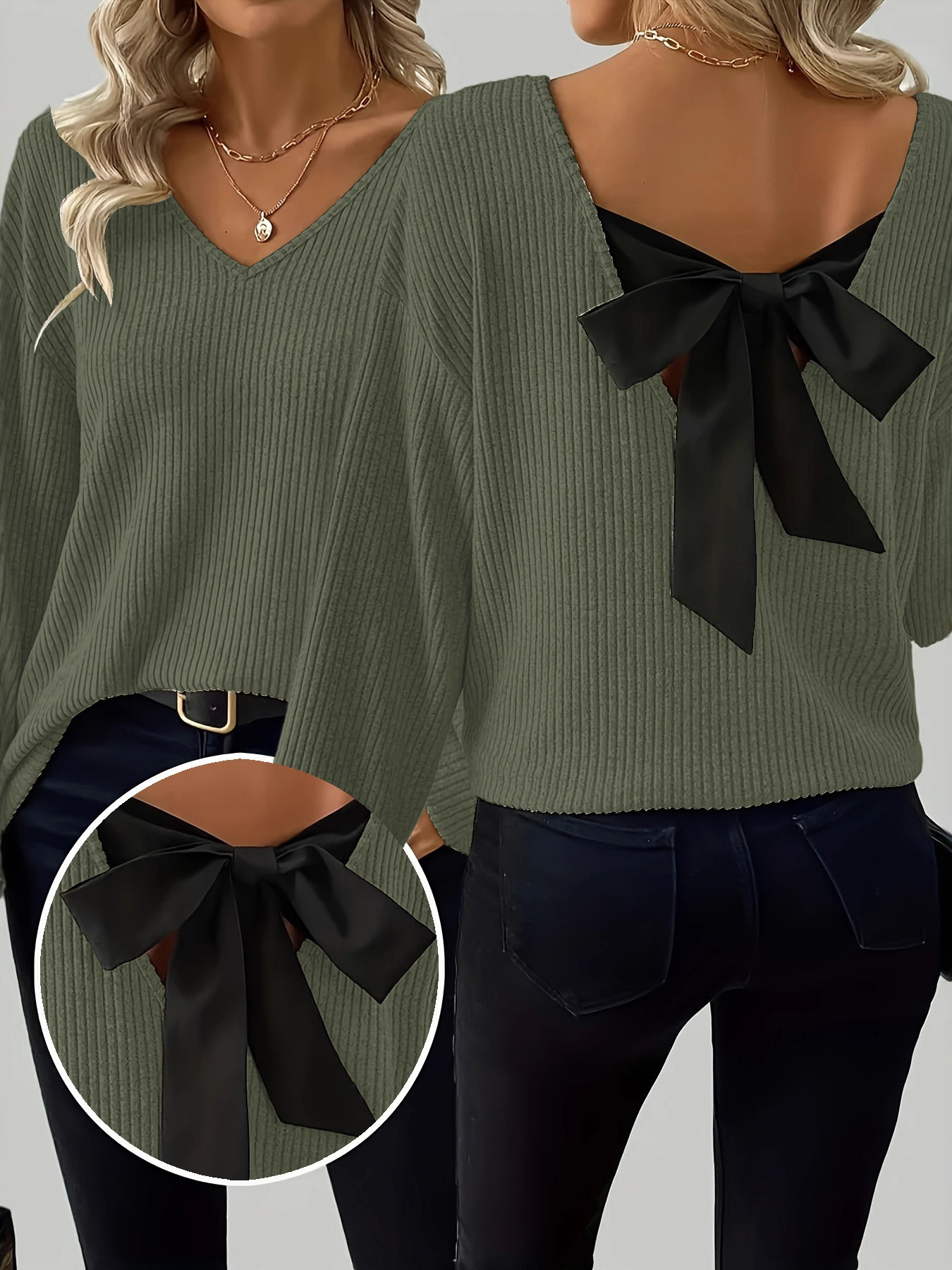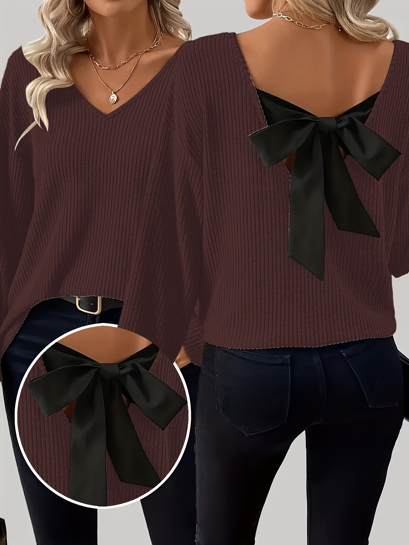 Full Size Ribbed Knit Backless Bow T-Shirt Plus Size