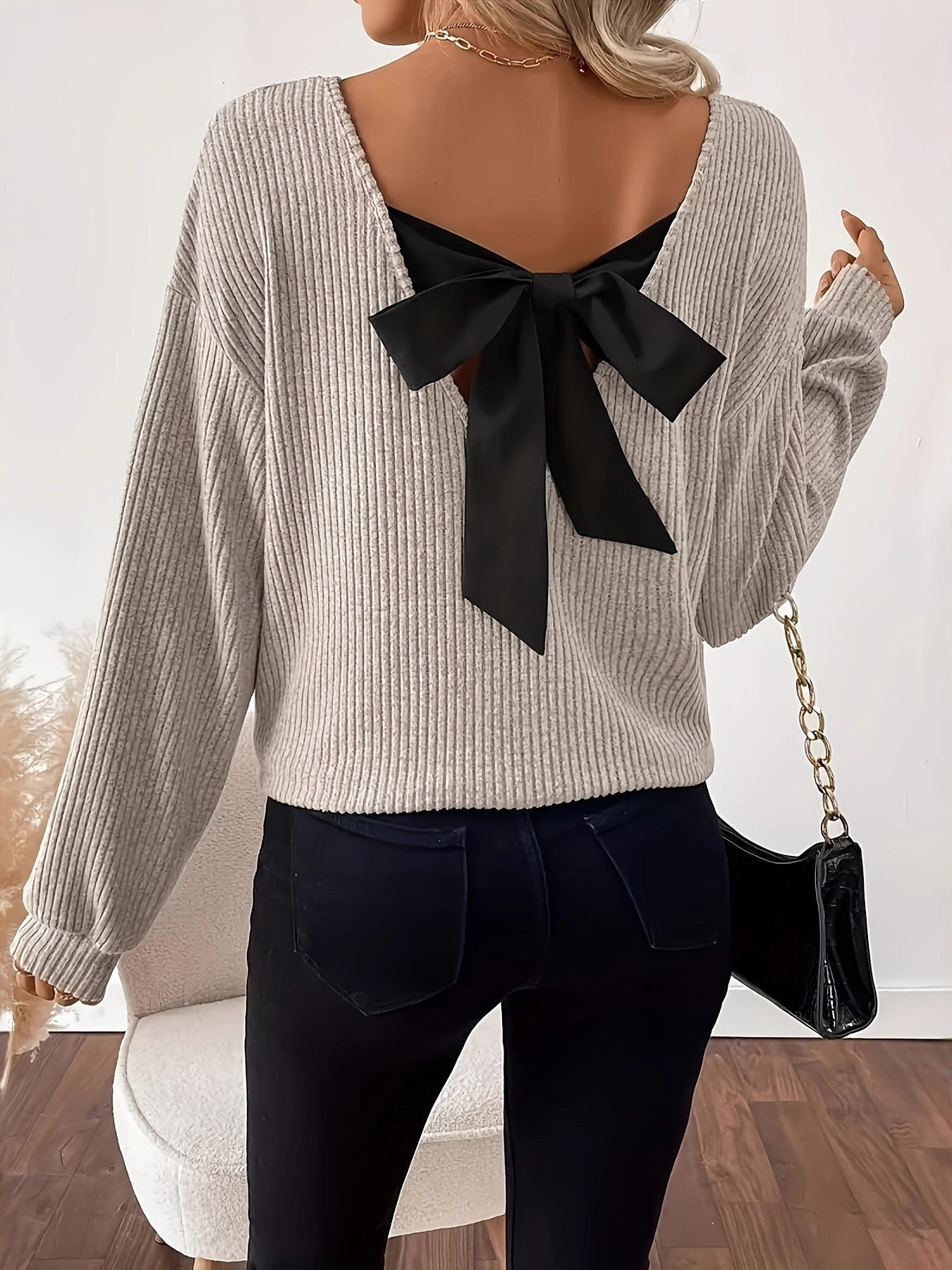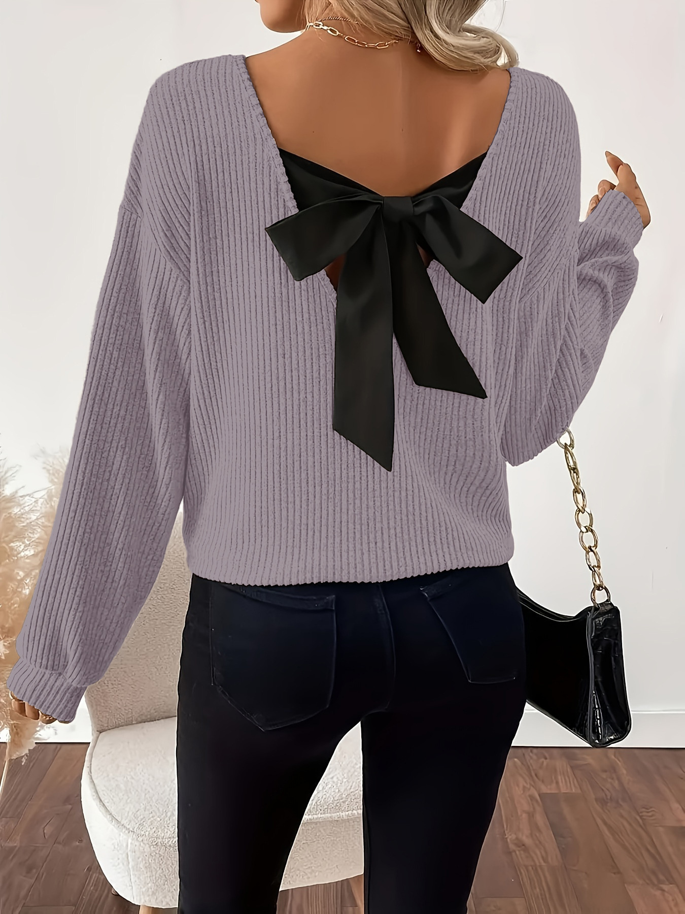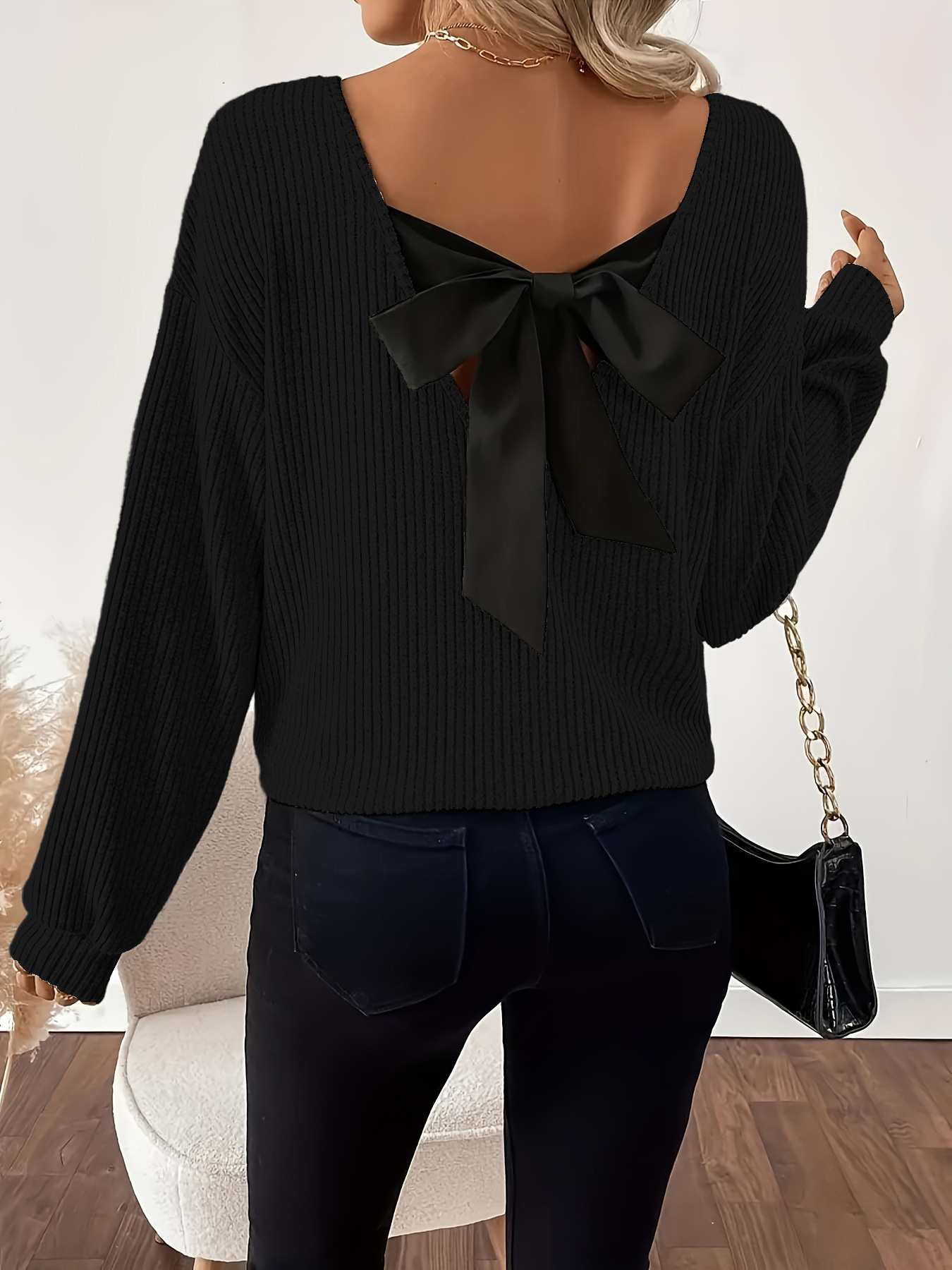 Full Size Ribbed Knit Backless Bow T-Shirt Plus Size