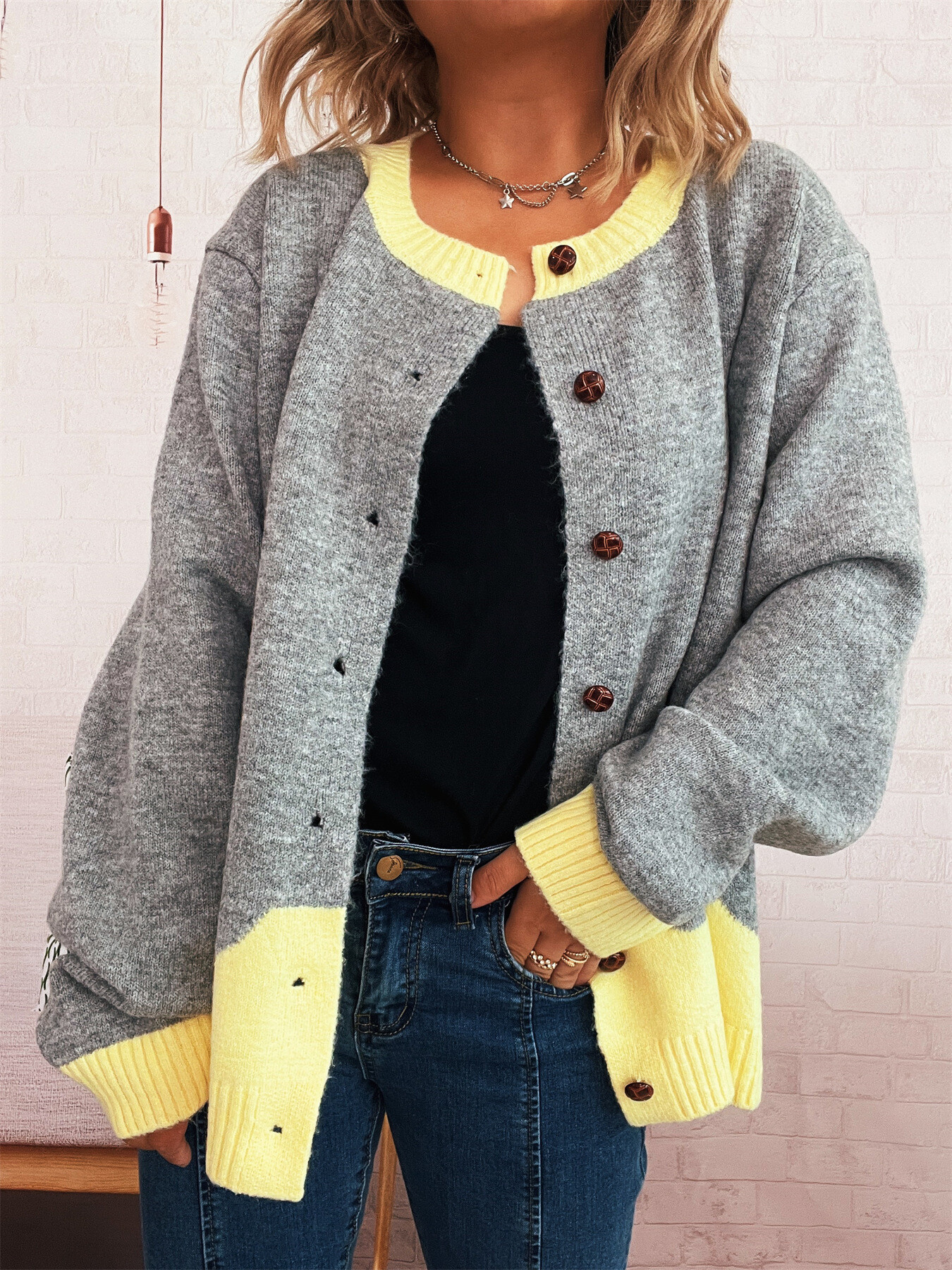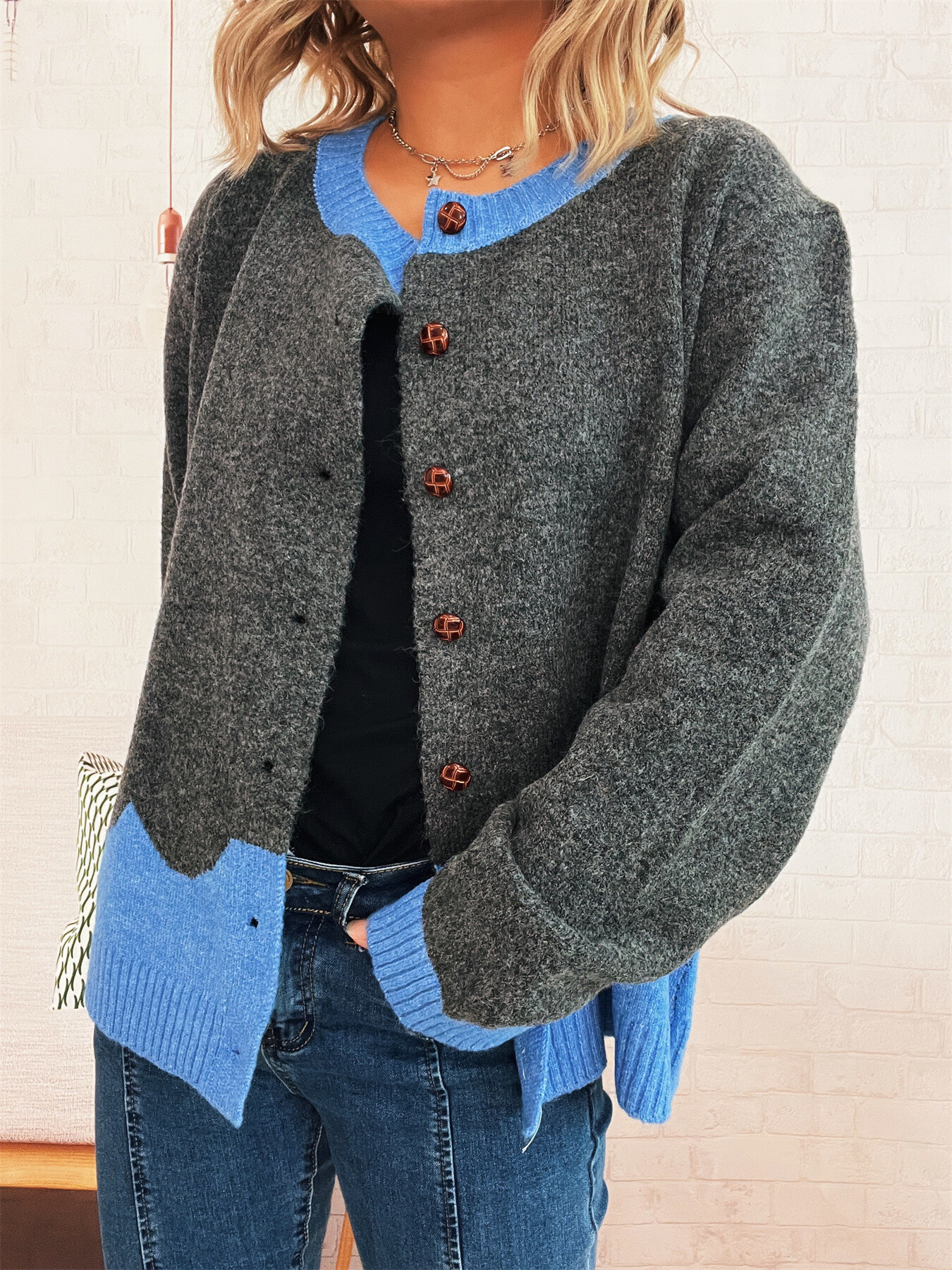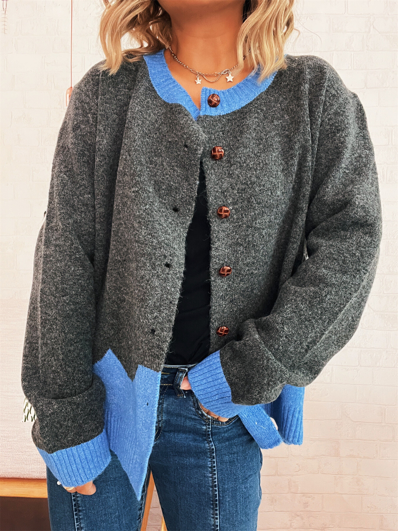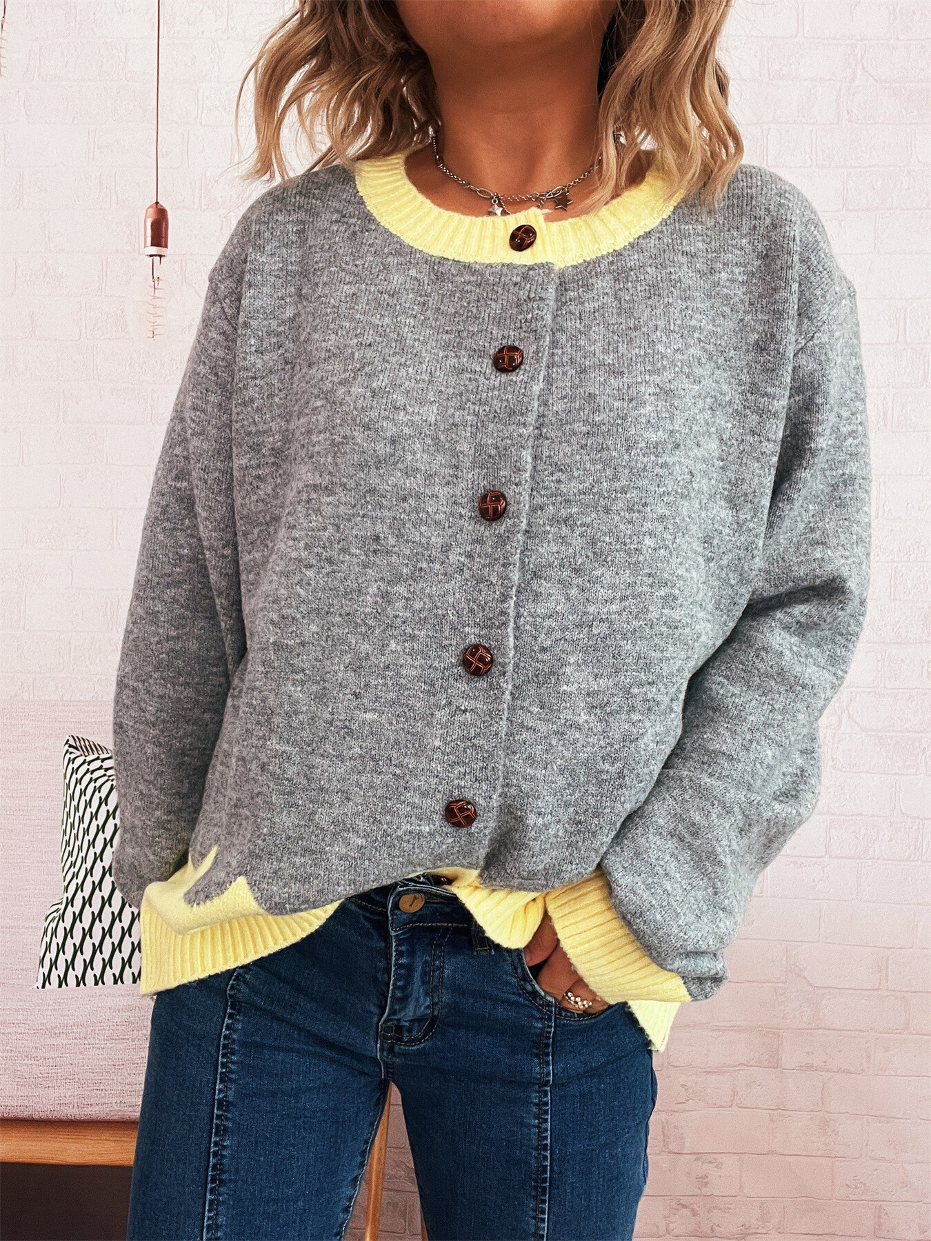 Button-Front Contrast Trim Cardigan