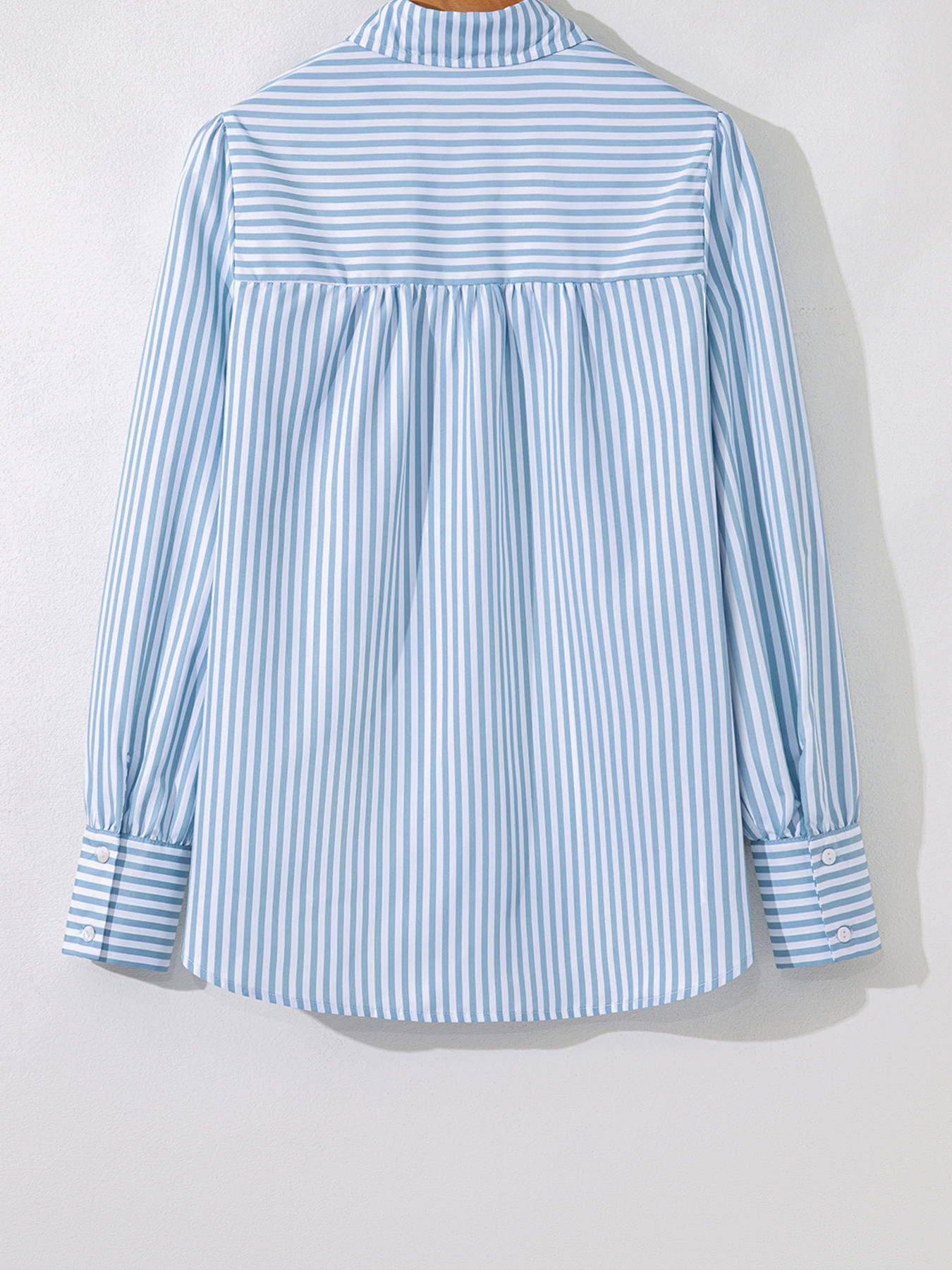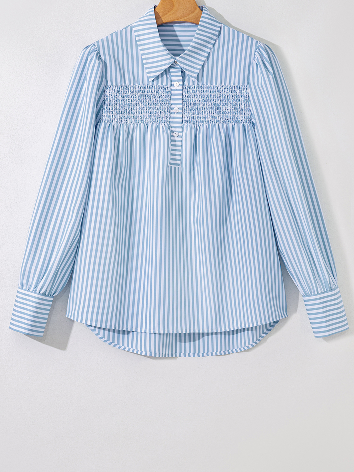 Stripe Shirred Detail Half Placket Collared Long Sleeve Shirt