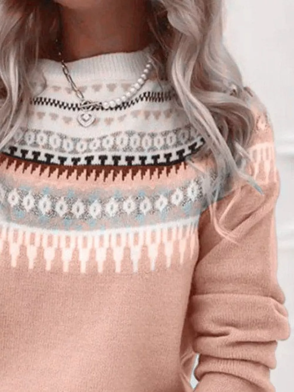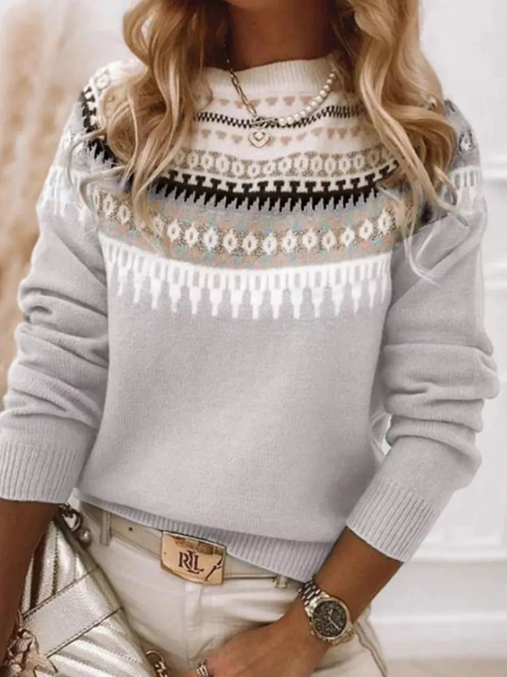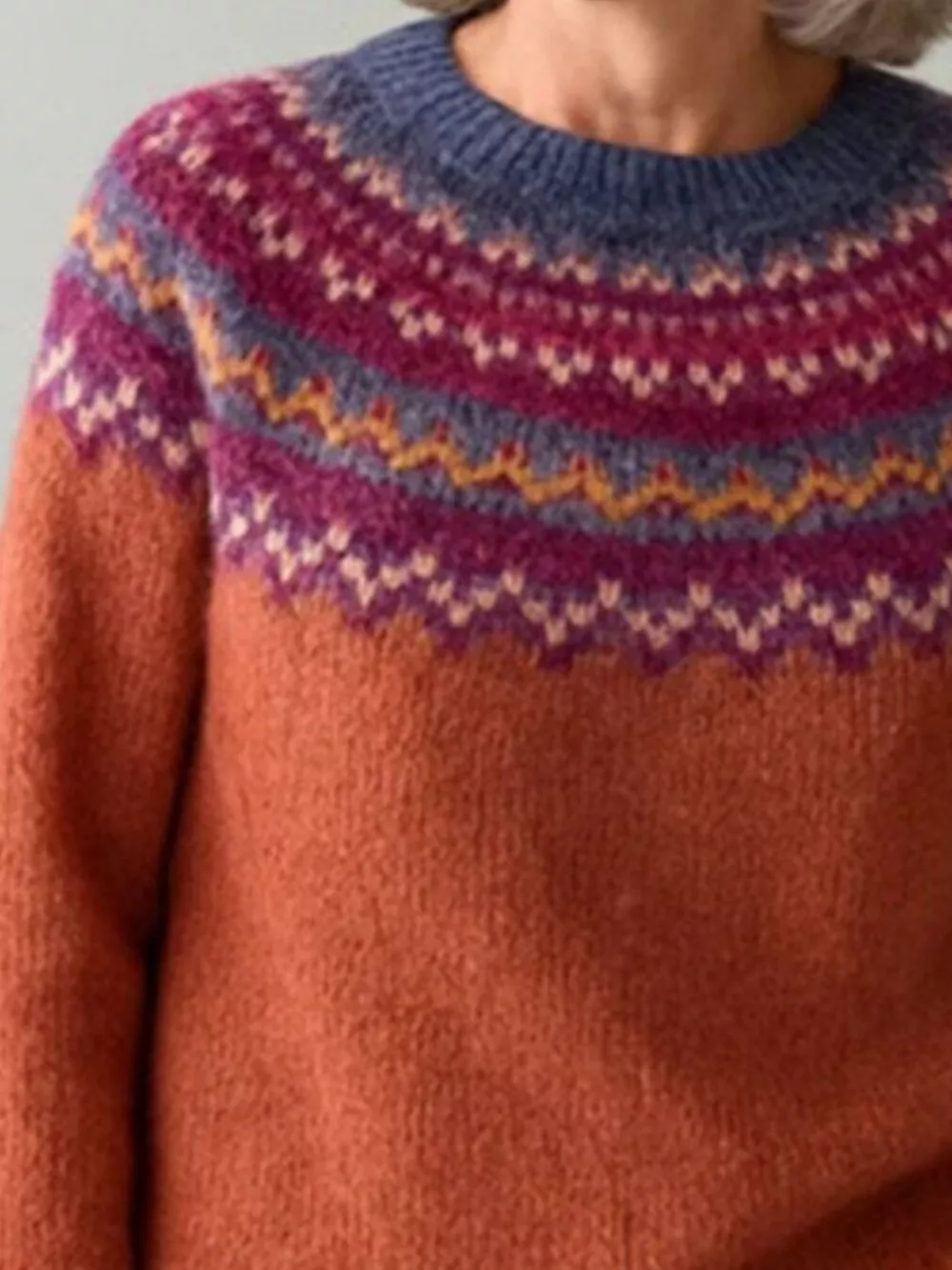 Full Size Vintage Patterned Round Neck Sweater Plus Size