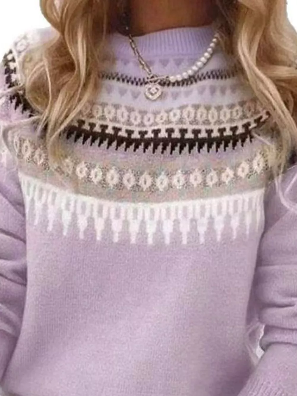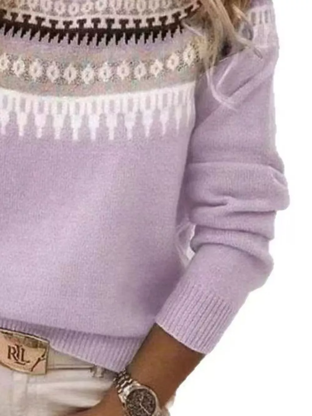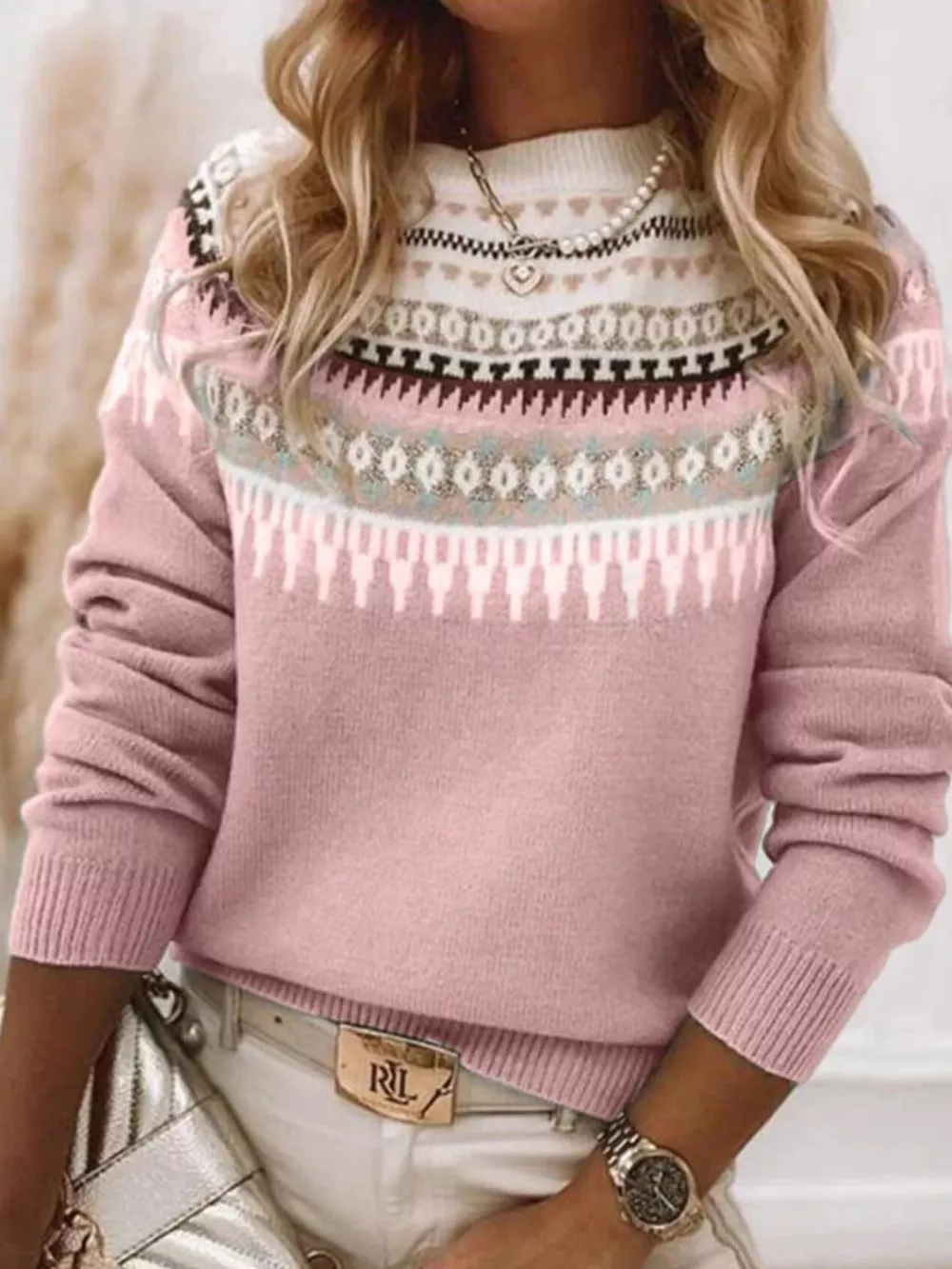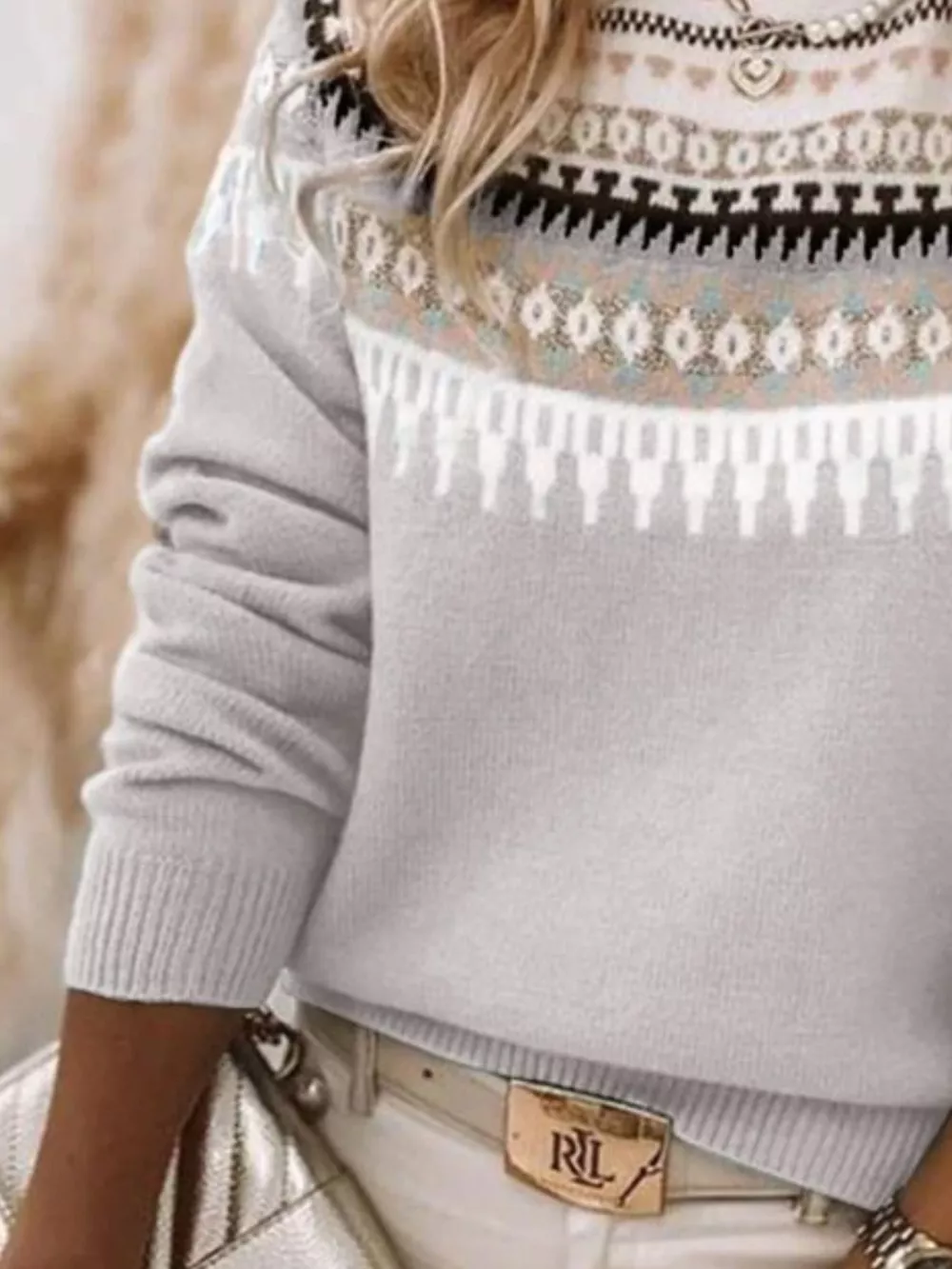 Full Size Vintage Patterned Round Neck Sweater Plus Size