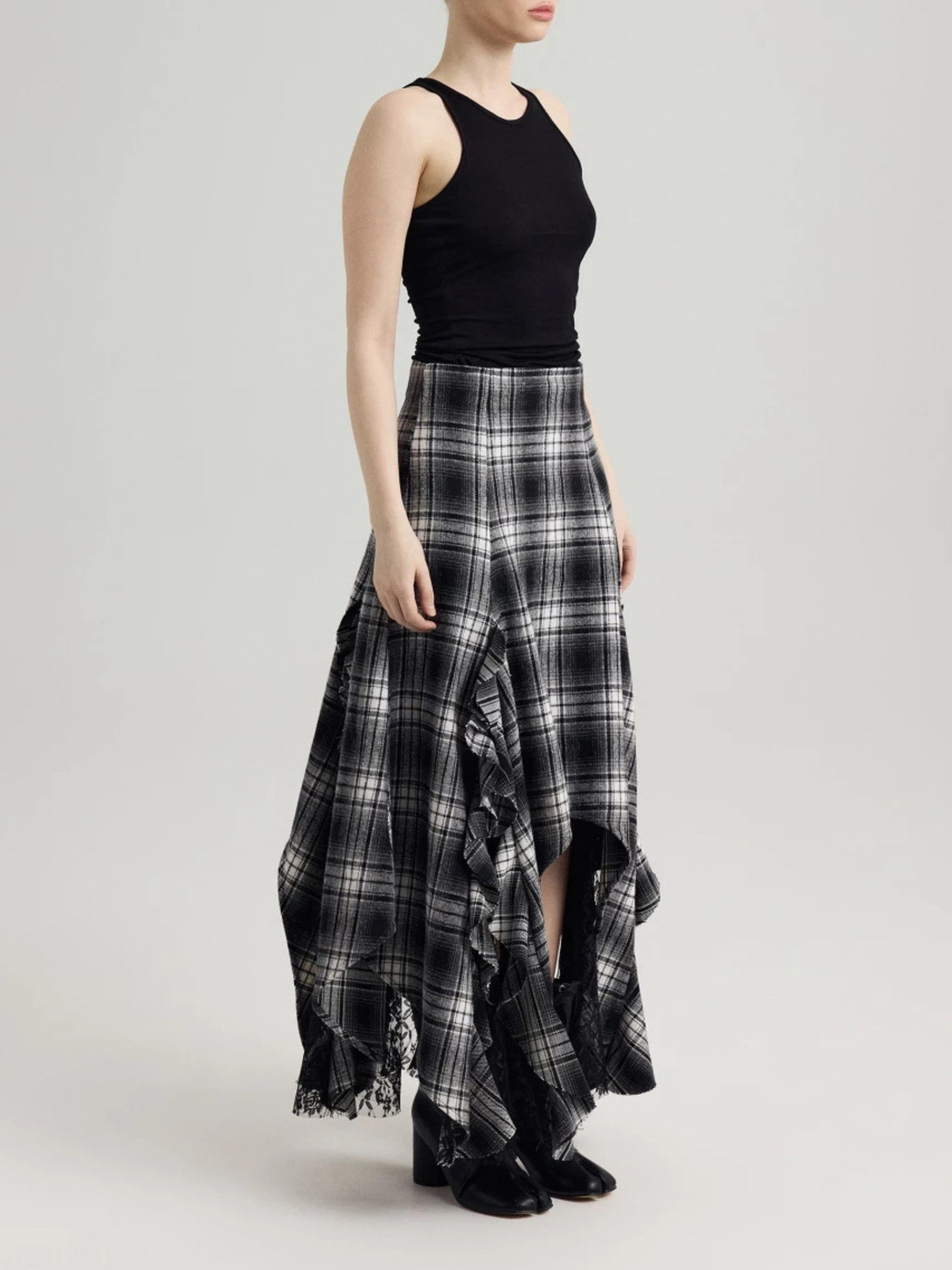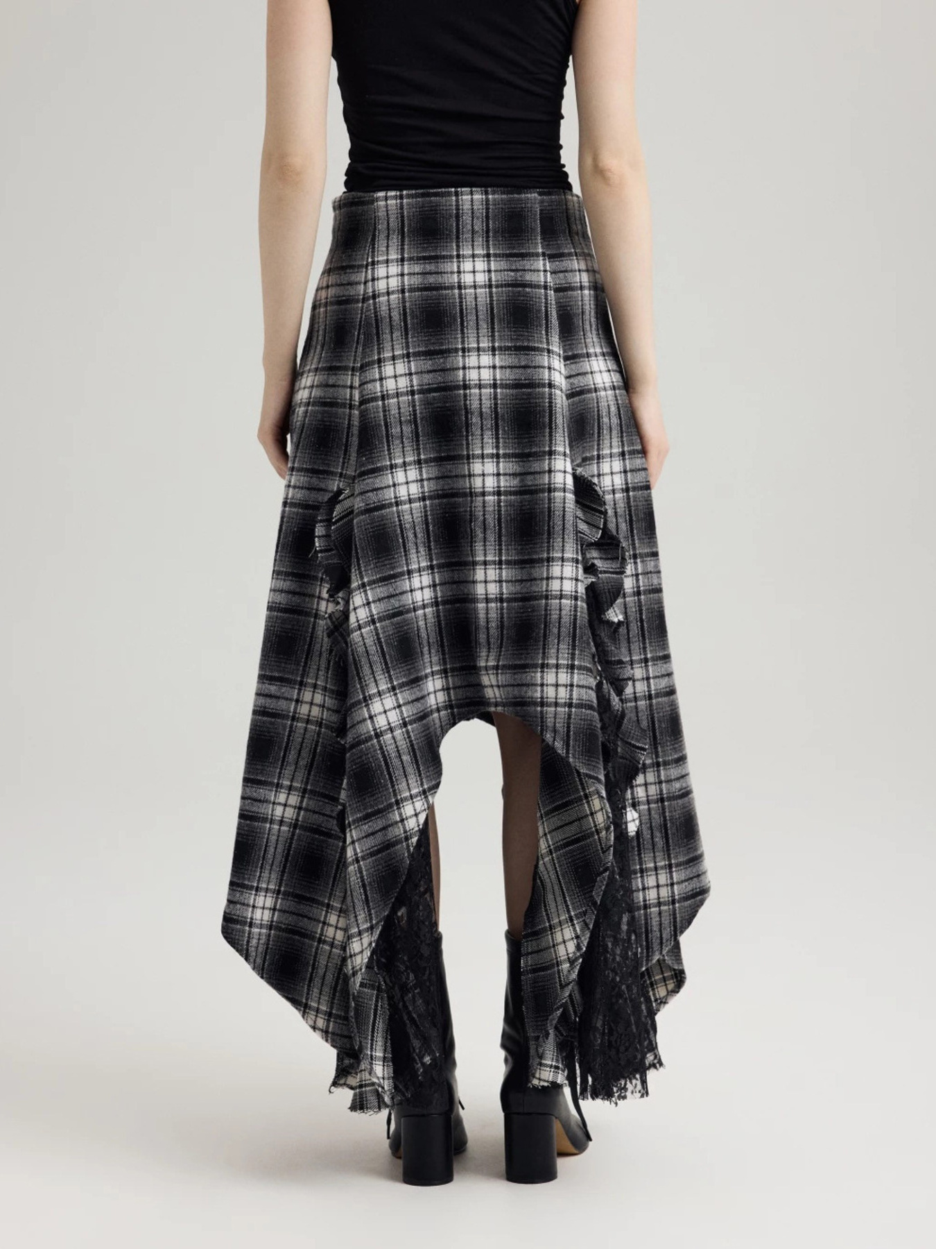Asymmetrical Plaid Ruffle Midi Skirt