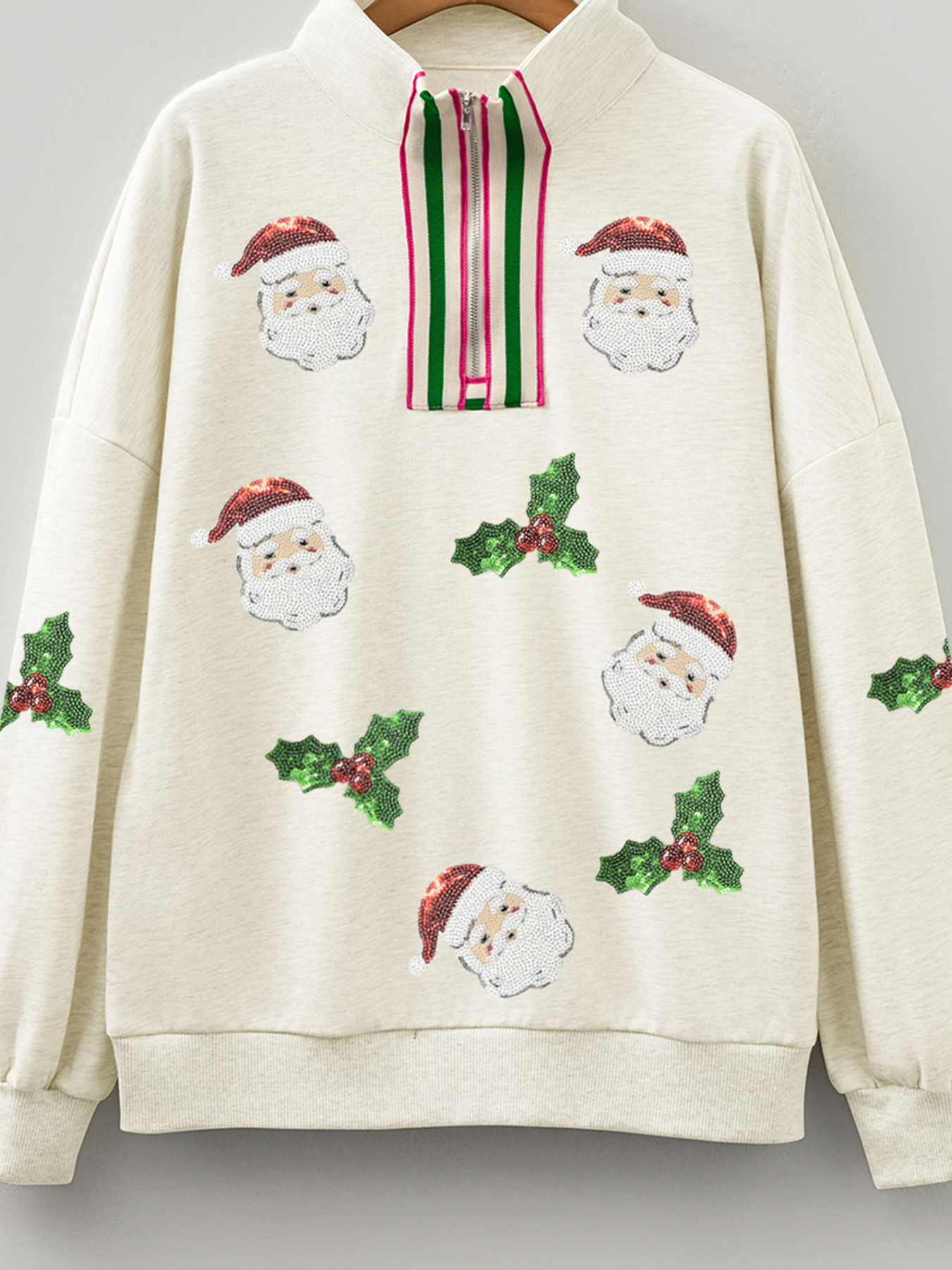 Sequin Santa Christmas Holly Patched Striped Trim Zip V Neck Sweatshirt