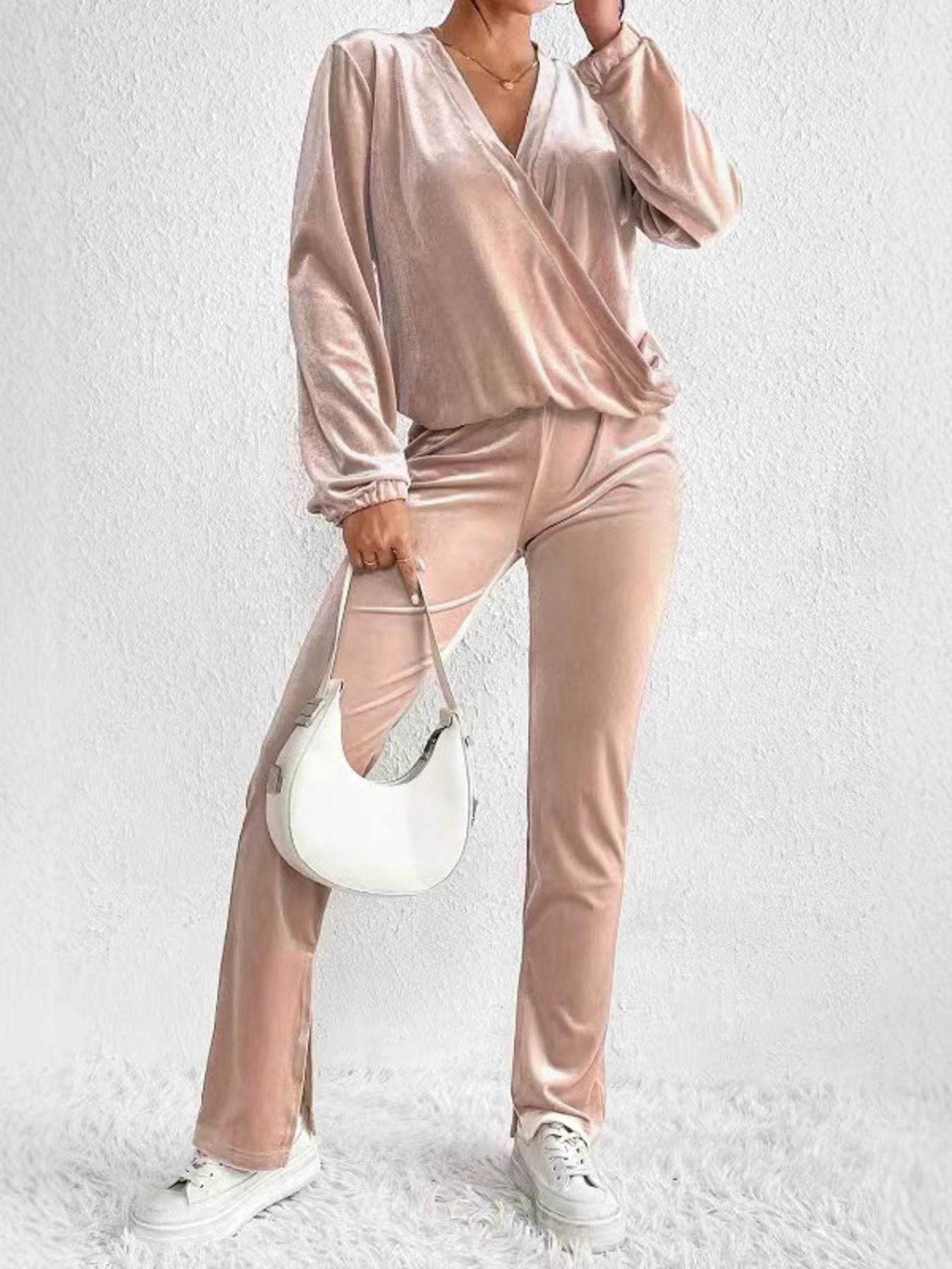 Plus Size Surplice Long Sleeve Top And Pants Set